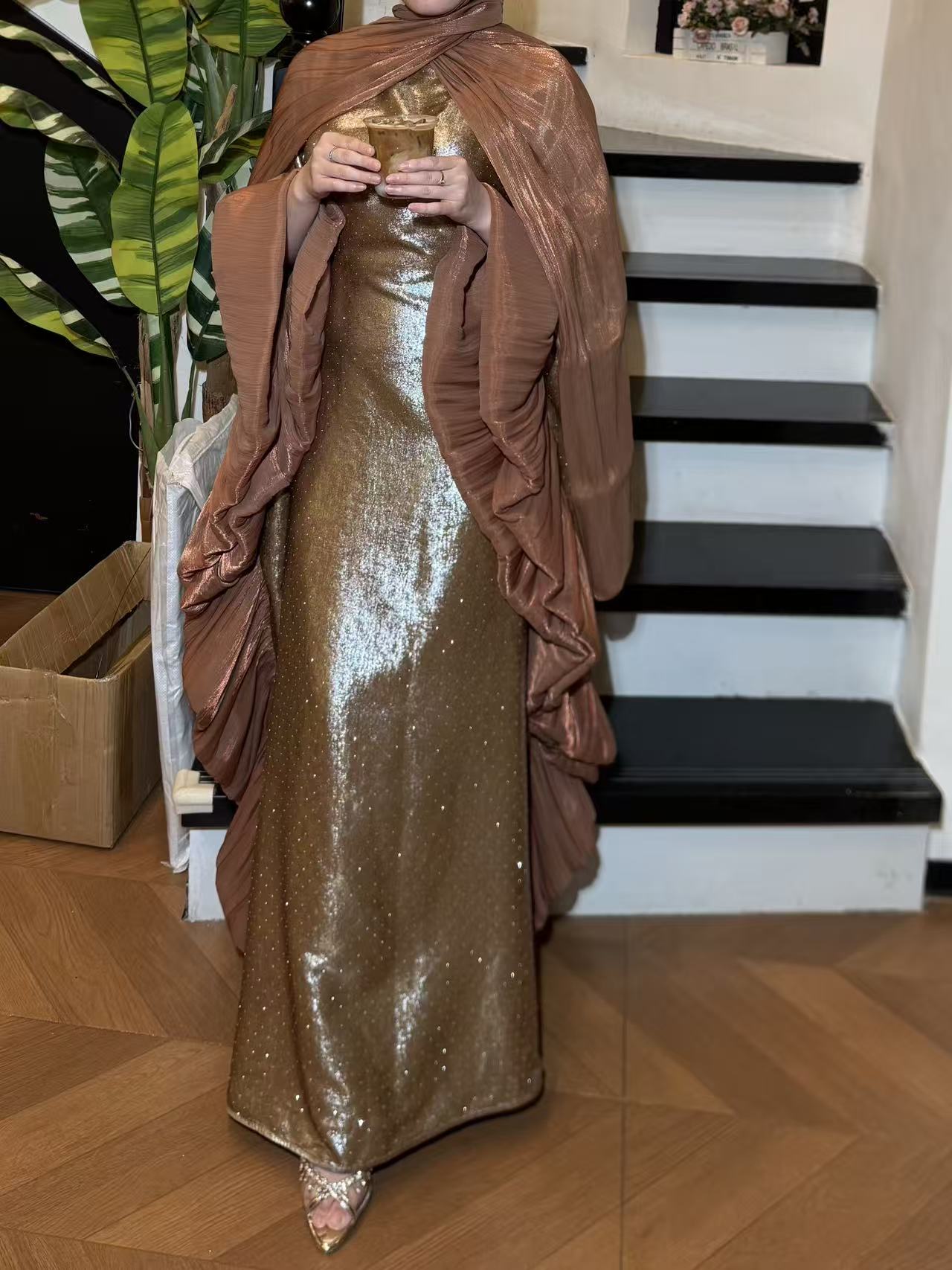 The fabric is very luxurious, not the shiny or heavy kind, but with just the right amount of sheen and subtle sparkling rhinestones, giving it an elegant look. I usually wear a large, and this time I ordered a large, which fits perfectly. This is exactly how you want an abaya to fit. The cape flows gracefully like the wind.
