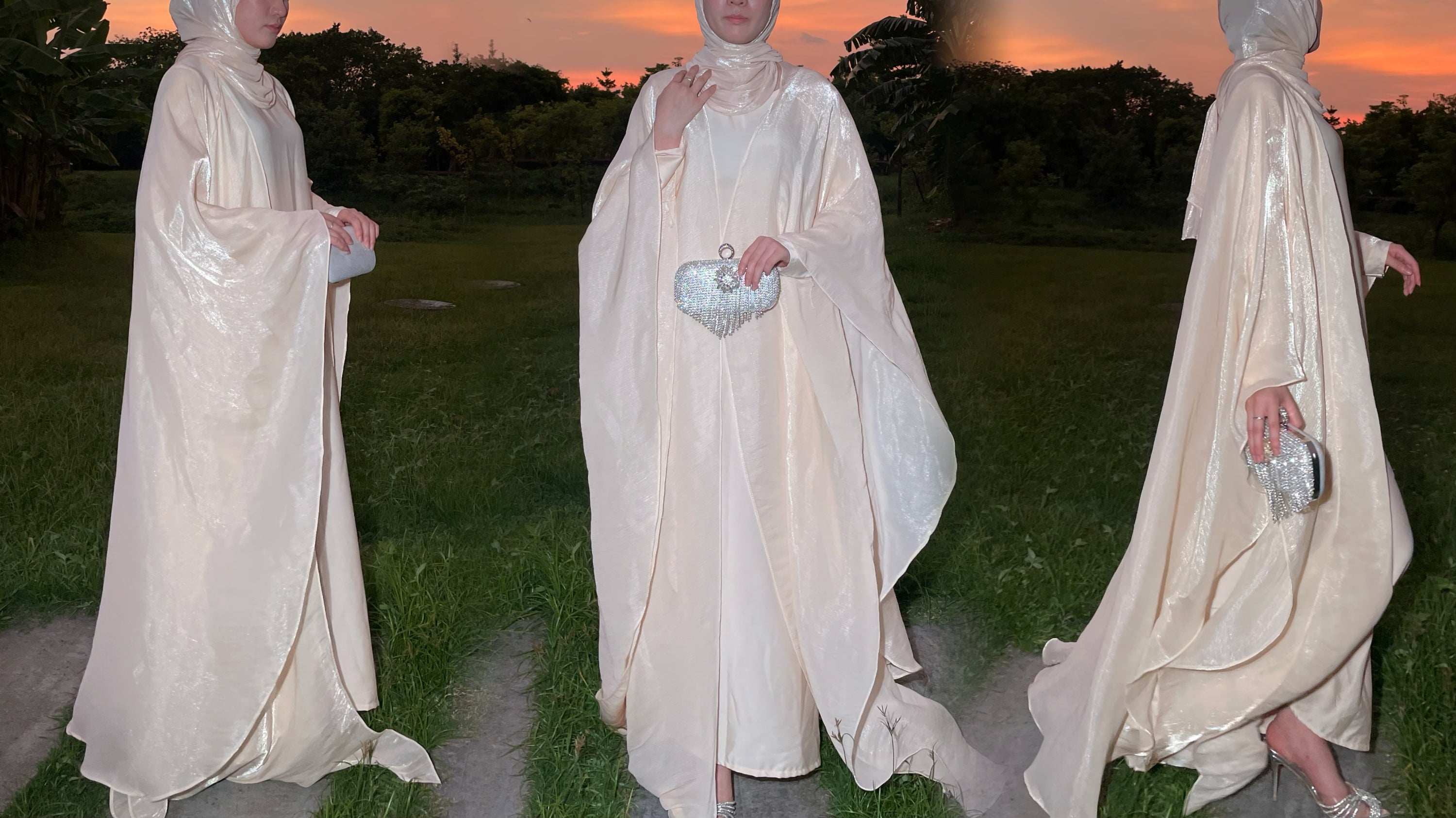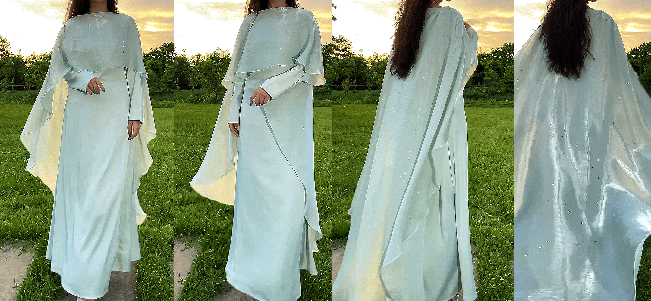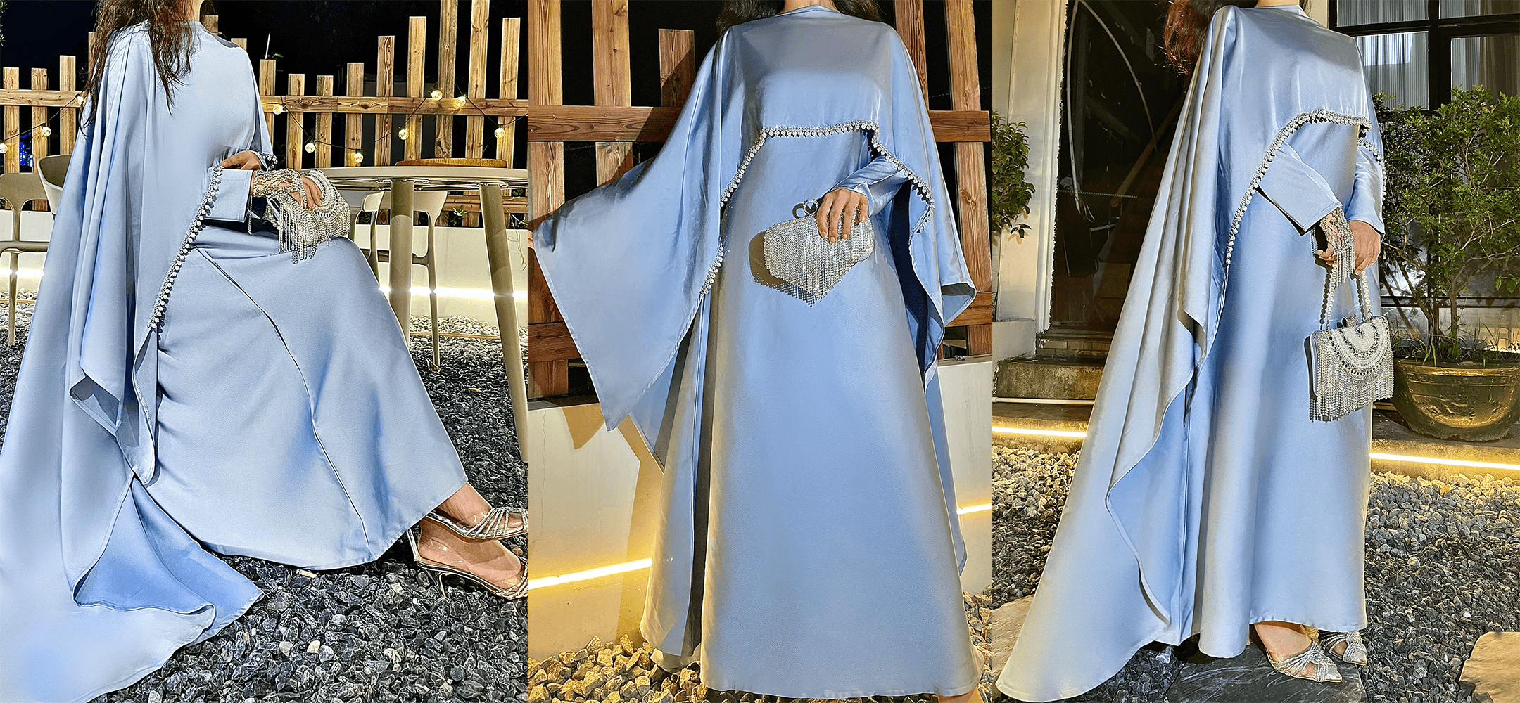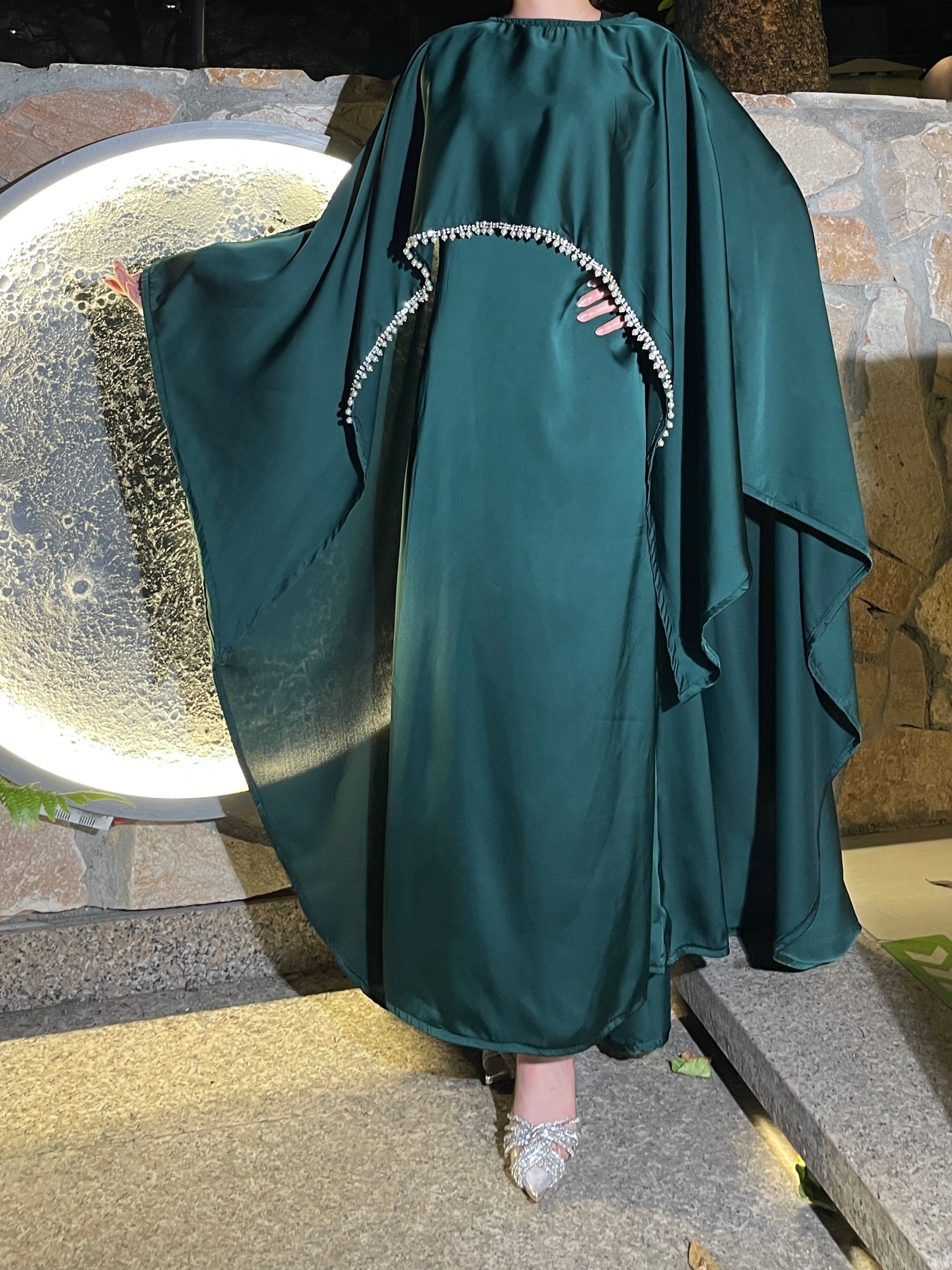 The fabric is very luxurious, not the shiny or heavy kind, but with just the right amount of sheen and subtle sparkling rhinestones, giving it an elegant look. I usually wear a large, and this time I ordered a large, which fits perfectly. This is exactly how you want an abaya to fit. The cape flows gracefully like the wind.
